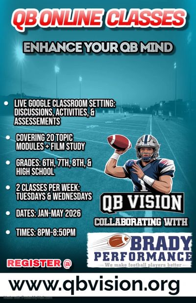 At QB Vision, we train the most important muscle a Quarterback has....THE MIND! Our live, online classes give Quarterbacks the tools to read defenses, master football terminology, and making lighting- fast decisions under pressure.